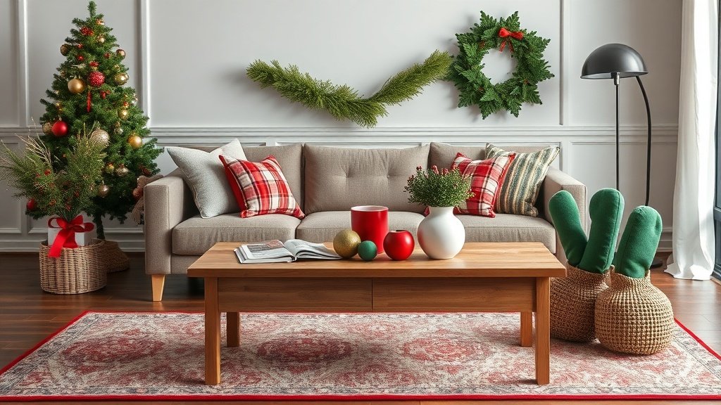 Careful placement is crucial when incorporating festive elements. Your coffee table serves as a central focal point, making it an ideal canvas for seasonal styling. Choose decorative items that create visual interest without cluttering the space. A beautiful ceramic vase with deep green pine branches or a carefully arranged tray with red and green ornaments can transform the entire room’s atmosphere.